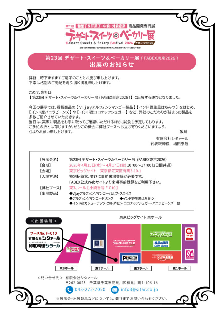 今回の展示では、看板商品の 【 Vijayアルフォンソマンゴー製品 】 【 インド 野生黒はちみつ 】 をはじめ、【 インド産バニラビーンズ 】 や 【 インド産ココナッツシュガー 】 など、 弊社のこだわりが詰まった製品を多数ご紹介させていただきます。