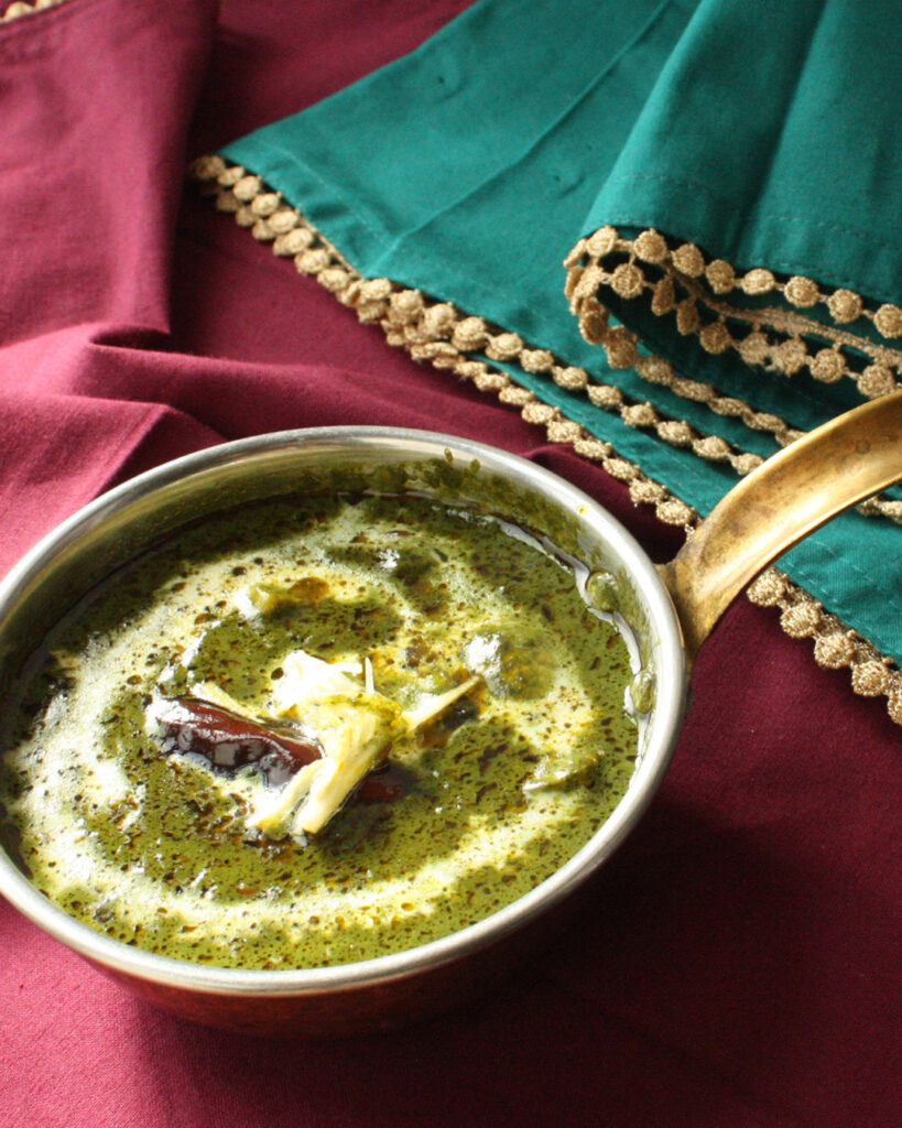A wholesome curry made with tender organic spinach and savory mushrooms, flavored with garlic and spices for a healthy, satisfying meal.